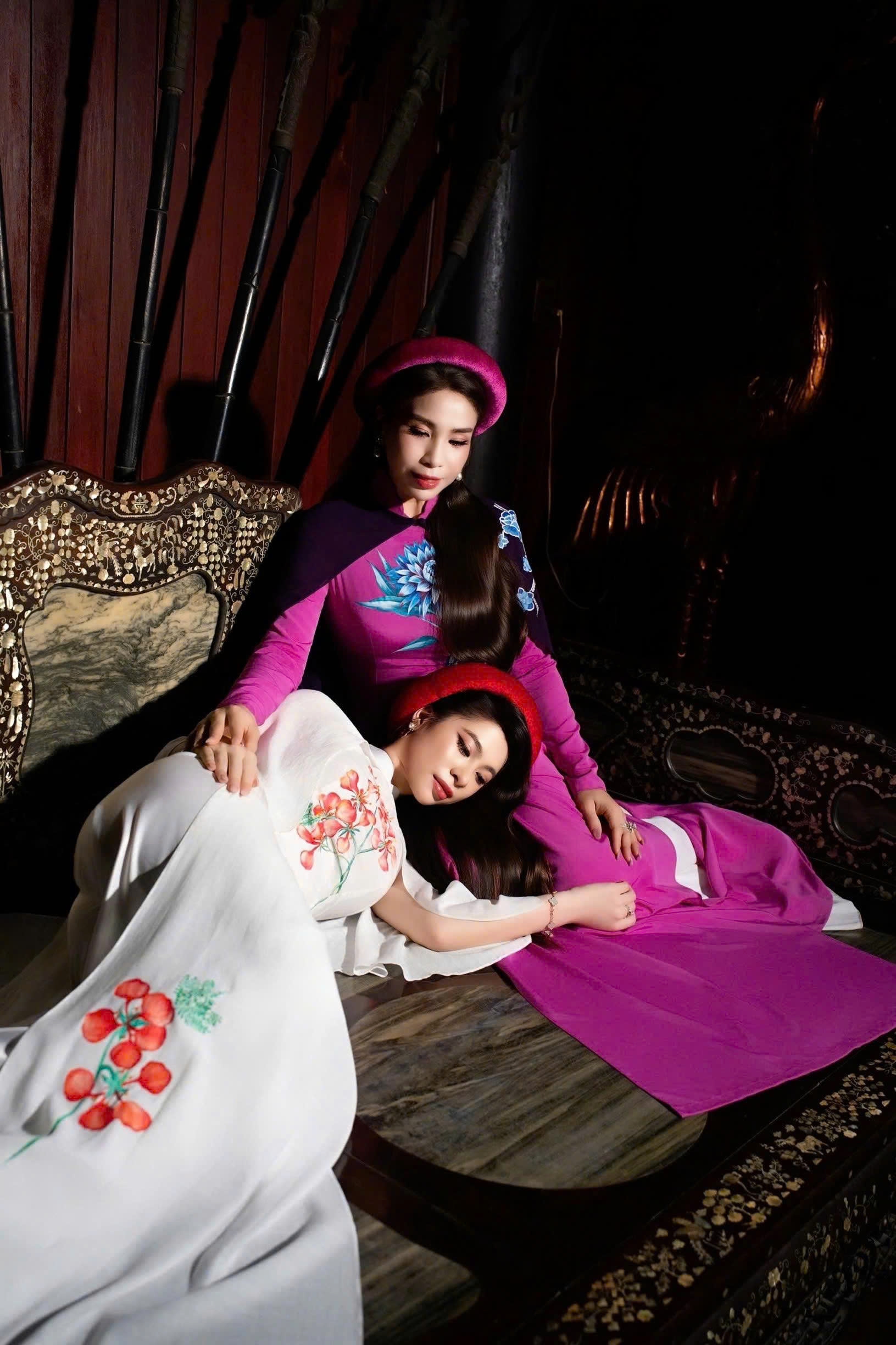 Giữa không gian cổ kính với những mảng tường trầm mặc và ánh sáng đổ nghiêng như một thước phim xưa, hai mẹ con xuất hiện trong tà áo dài lụa và chiffon mềm rũ. Không cần tạo dáng cầu kỳ, chỉ một chuyển động nhẹ cũng đủ làm chất liệu bắt sáng, để từng đường nét cơ thể được tôn lên một cách tinh tế.